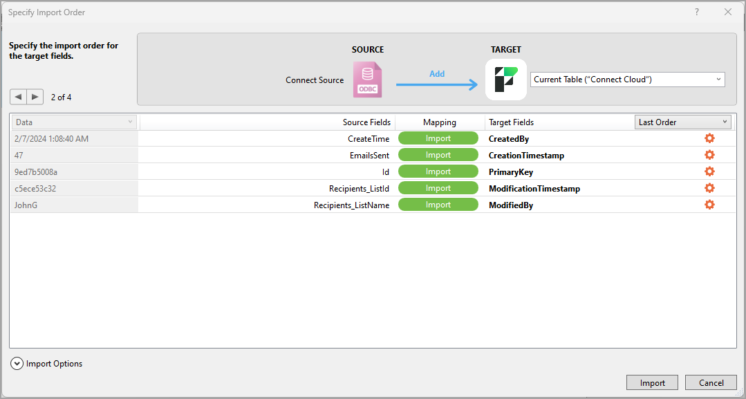 A Specify Import Order dialog appears, where you can customize how and into which table you want to import the Connect AI data into FileMaker Pro.