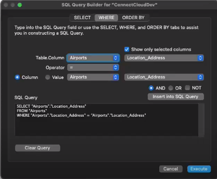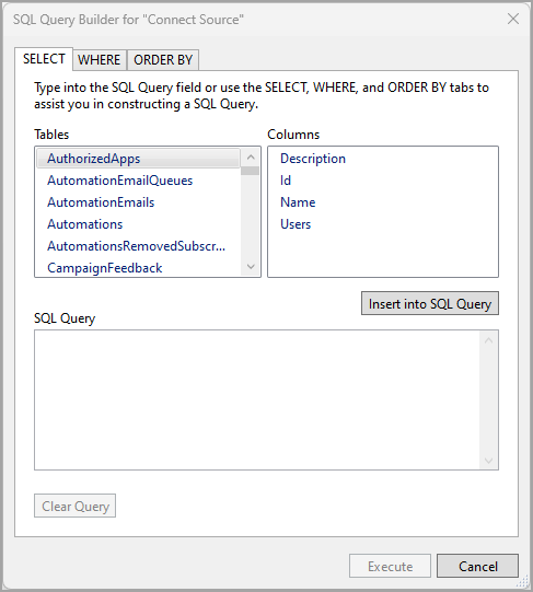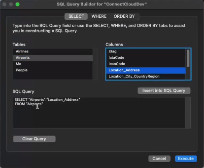 When the Connect AI data is finished importing, a SQL Query Builder dialog appears.