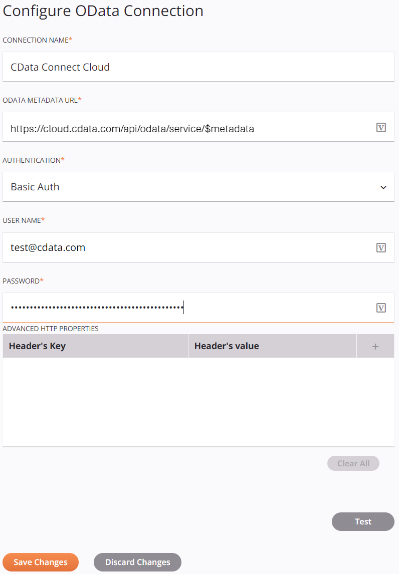 - OData Metadata URL—enter the metadata URL: https://cloud.cdata.com/api/odata/{workspace\_name}/$metadata.