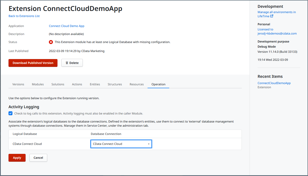 In the Service Center, associate the name of the Logical Database to the Database Connection the Extension Module will use and click Apply.